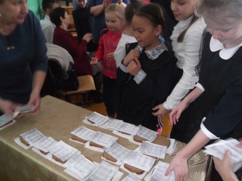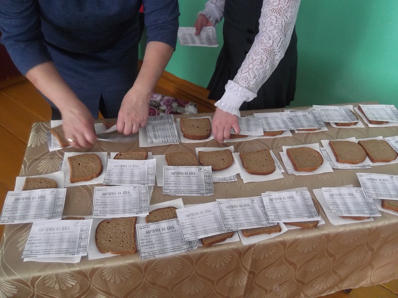 На столе были разложены карточки, по которым ленинградцы получали хлеб и кусочки хлеба. Все присутствующие 44 человека получили кусочки блокадного хлеба. Мероприятие прошло очень тепло и трогательно. Ведущие Черницова В.М и Речкина Л.И. смогли достучаться до сердец присутствующих и растрогать до слез. В завершение ведущие призвали ребят и взрослых призывом «Сохраним историческую память вместе!»