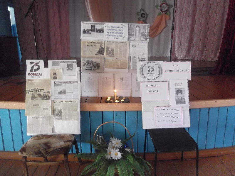 14 февраля 2020 года в Доме культуры села вторая Александровка в рамках проведения «Года памяти и славы» и Акции «Спасибо за все!» прошёл Час Воинской славы «Трагедия и доблесть Афгана», посвященный выводу советских войск из Афганистана. На мероприятие были приглашены учащиеся Александровской ООШ. В ходе общения дети познакомились с интересным материалом и выставкой о тех далеких, трагических событиях. Ведущая Черницова В.М рассказала об односельчанине воине-интернационалисте Айчанове Жайляу, а также о земляках Саракташского района. В завершение была зажжена «Свеча памяти», ребята почтили память погибших воинов, минутой молчания.